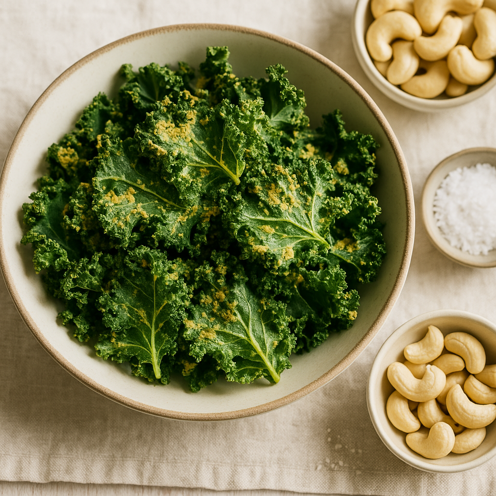 Hreinsið kasjúhnetur vel og blandið við hinum innihaldefnunum þar til kremað í öflugum blandara, bætið vatni ef of þykkt. Hellið yfir kálið og nuddið við í amk mínútu, þar til laufin eru vel þakin.